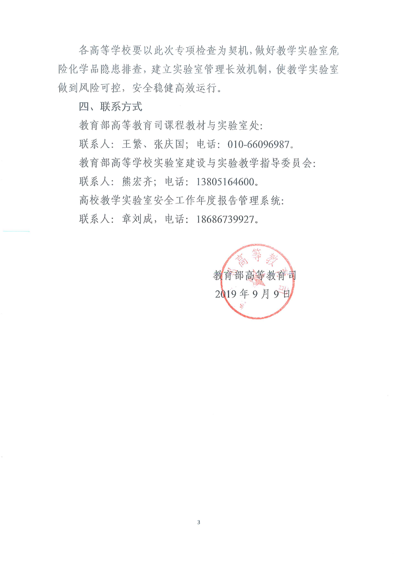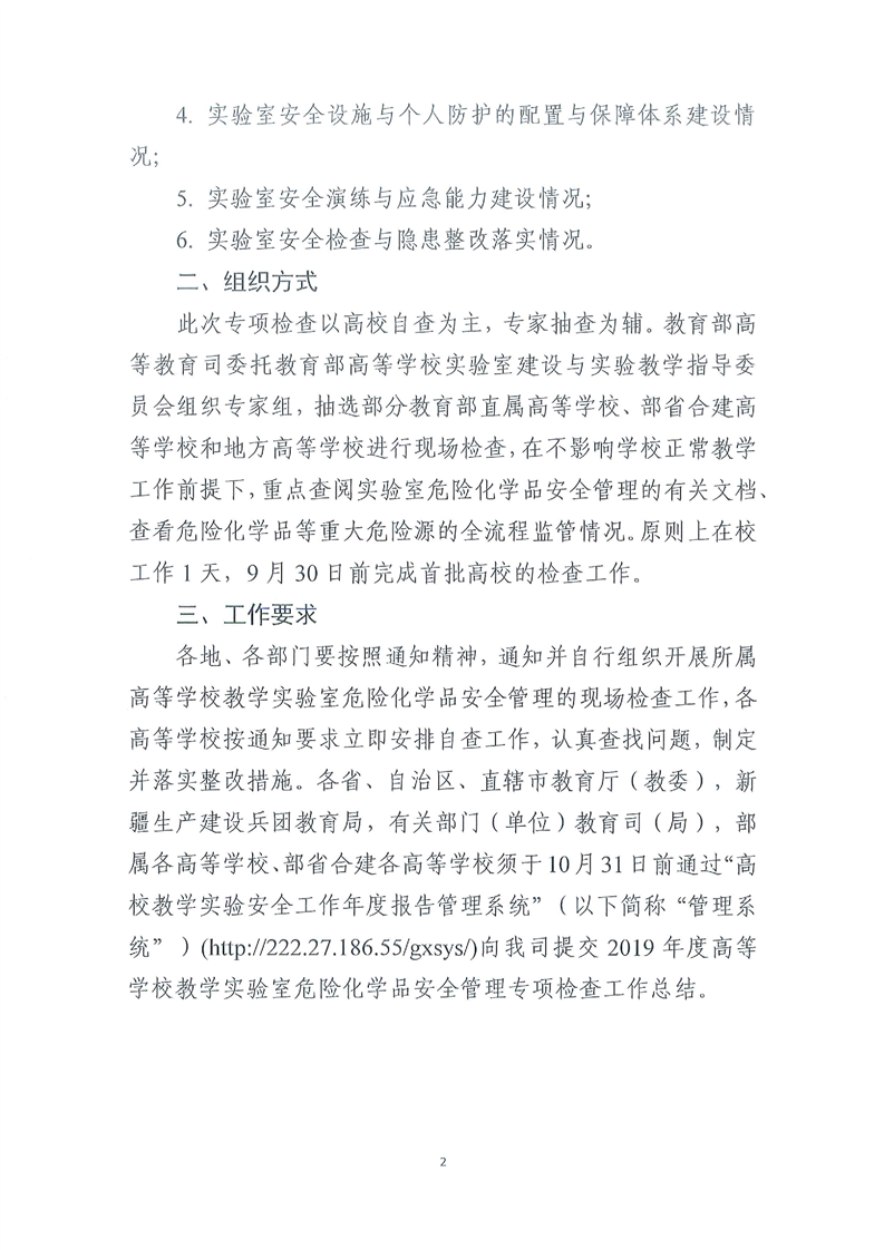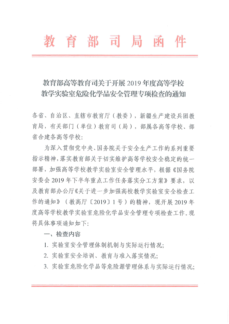 教育部高等教育司关于开展2019年度高等学校教学实验室危险化学品安全管理专项检查的通知