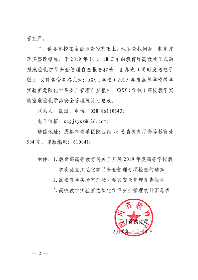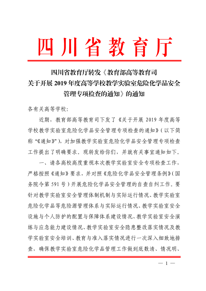 四川省教育厅转发《教育部高等教育司关于开展2019年度高等学校教学实验室危险化学品安全管理专项检查的通知》的通知