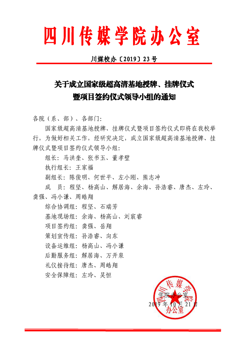 川媒校办2019-23关于成立国家级超高清基地授牌、挂牌仪式领导小组的通知