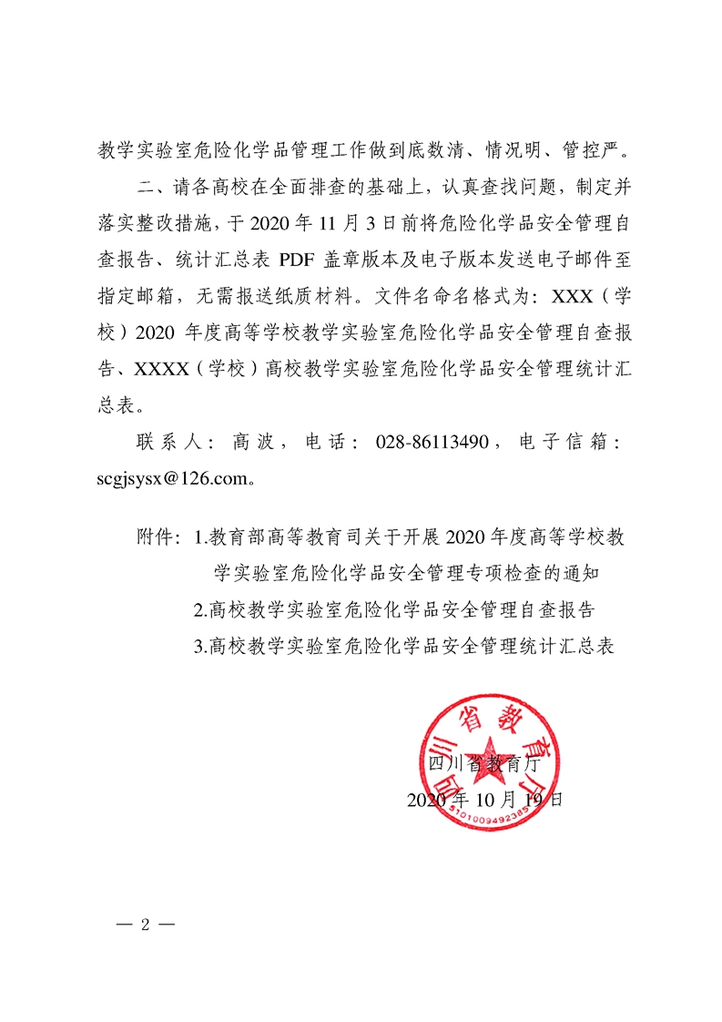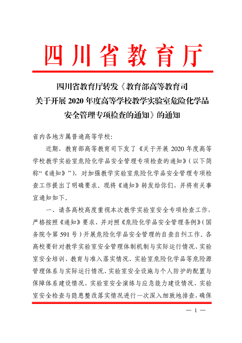 四川省教育厅转发《教育部高等教育司关于开展2020年度高等学校教学实验室危险化学品安全管理专项检查的通知》的通知