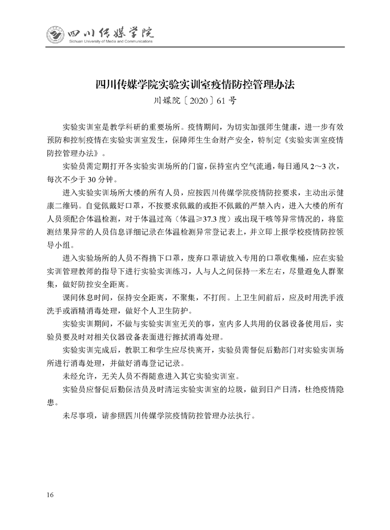 四川传媒学院实验实训室疫情防控管理办法