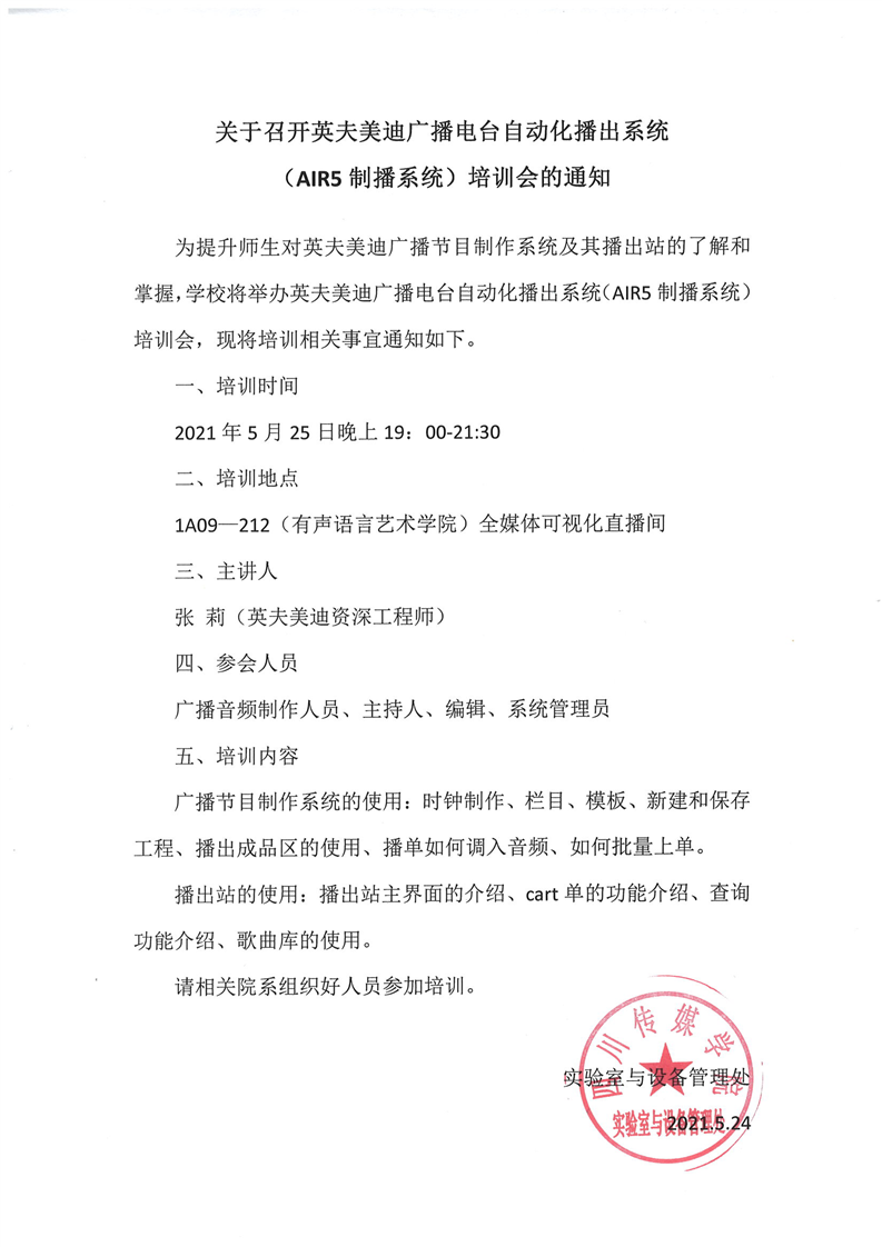 关于召开英夫美迪广播电台自动化播出系统(AIR5制播系统)培训会的通知