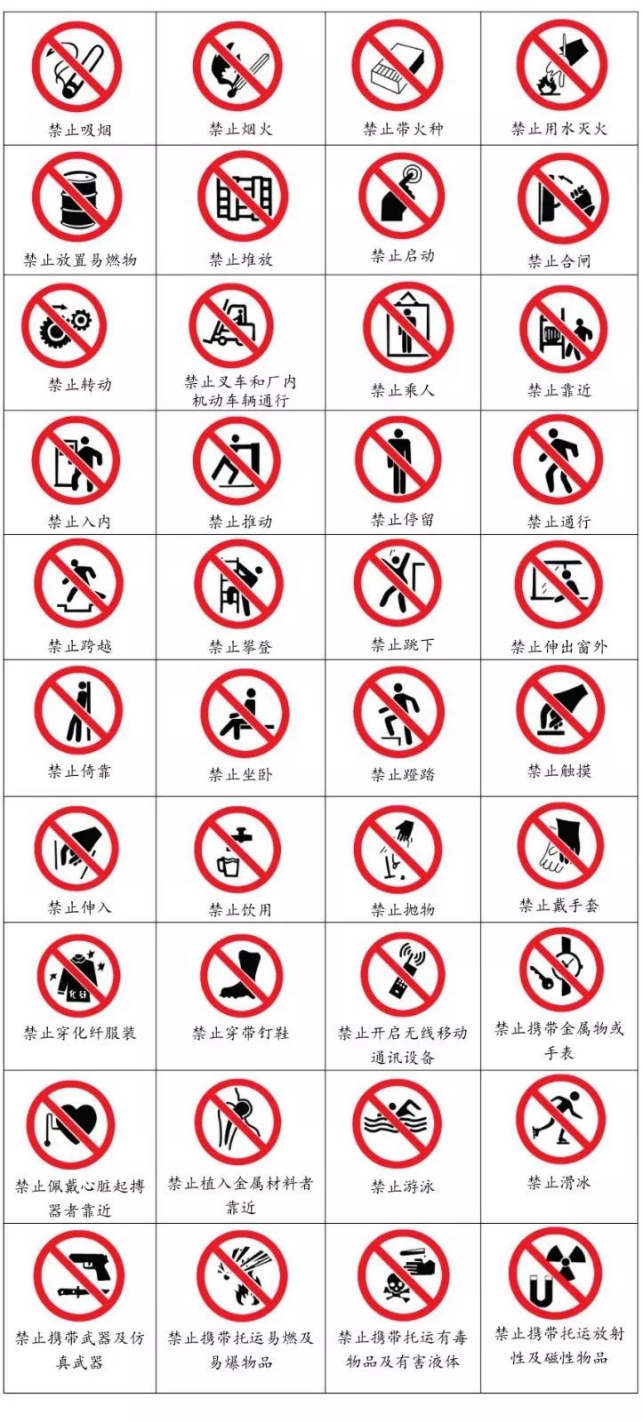 禁止标志是禁止人们不安全行为的图形标志。禁止标志的几何图形是带斜杠的圆环,其中圆环与斜杠相连,用红色;图形符号用黑色,背景用白色。