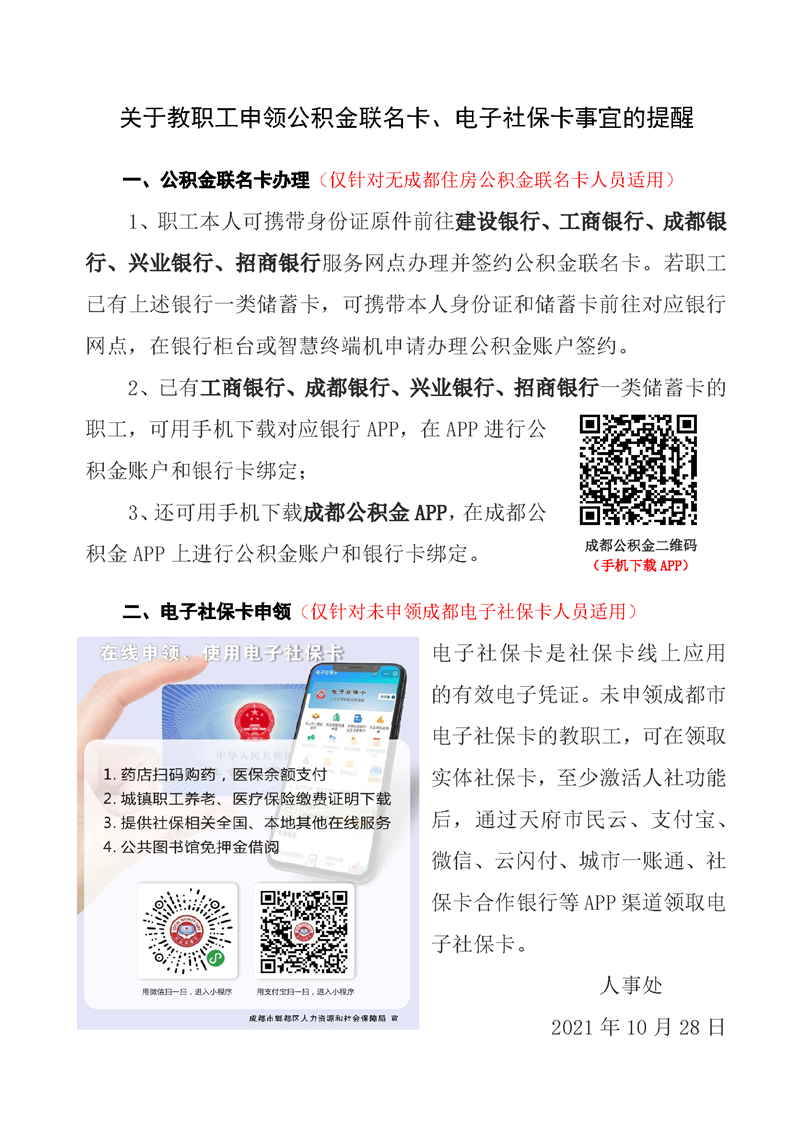 关于教职工申领电子社保卡、公积金联名卡事宜的提醒