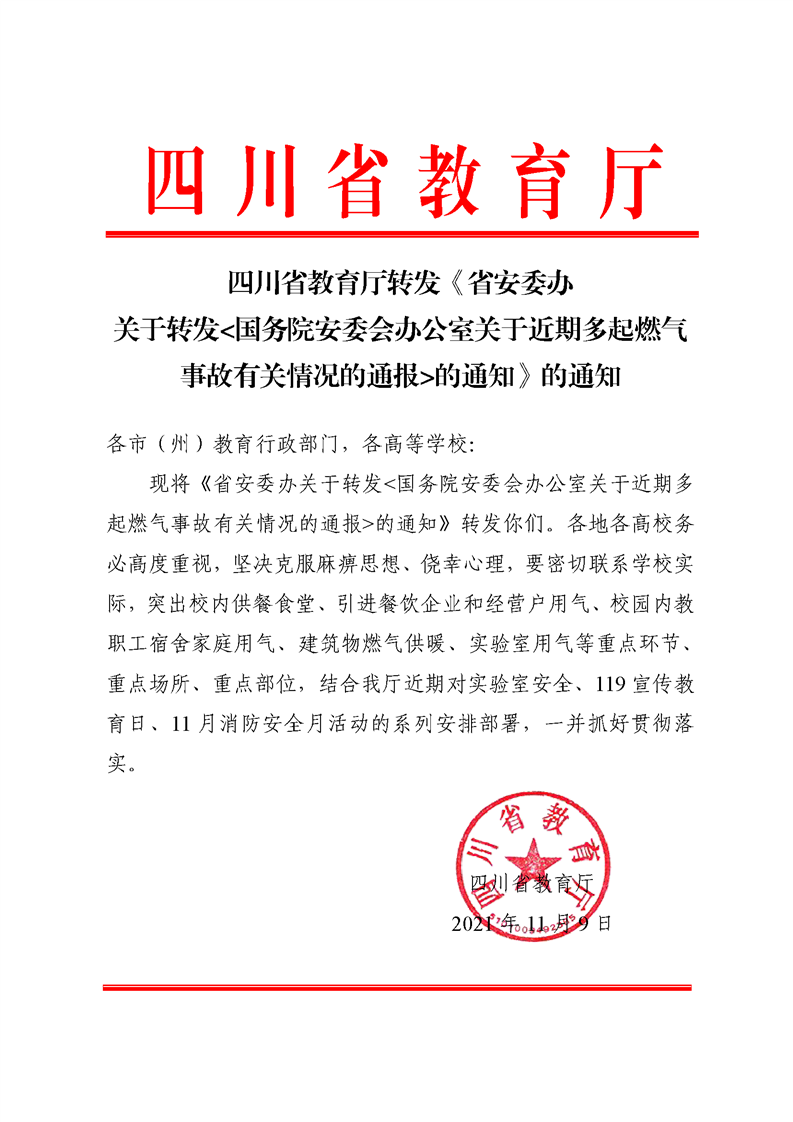 四川省教育厅转发《省安委办关于转发国务院安委会办公室关于近期多起燃气事故有关情况的通报的通知》的通知