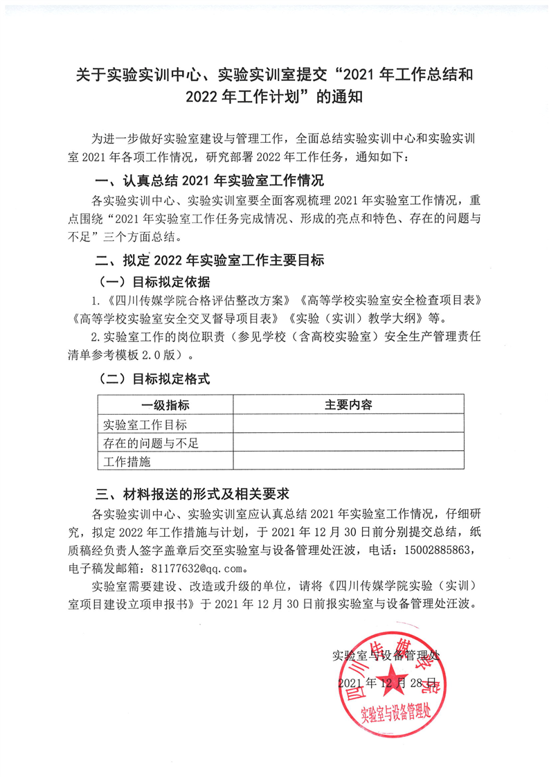 关于实验实训中心、实验实训室提交“2021年工作总结和2022年工作计划”的通知