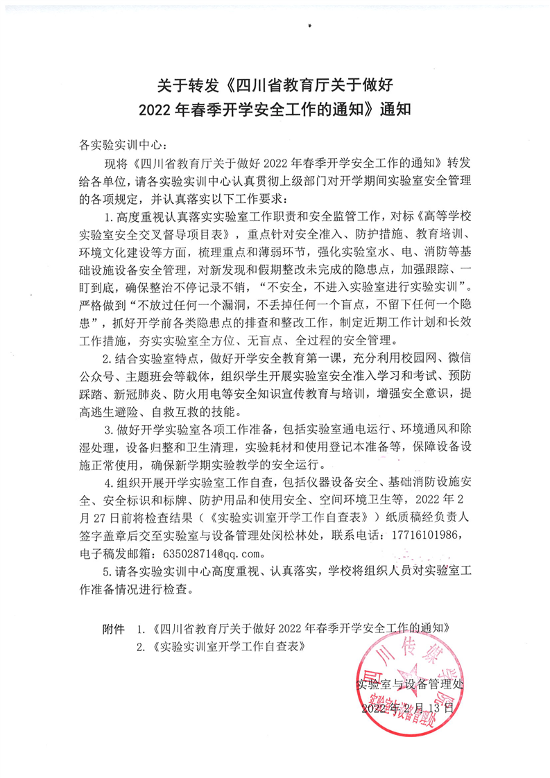 关于转发《四川省教育厅关于做好2022年春季开学安全工作的通知》