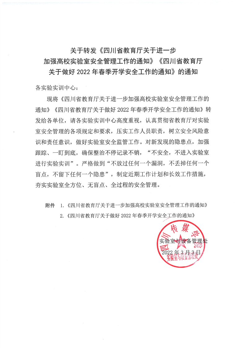 关于转发《四川省教育厅关于进一步加强高校实验室安全管理工作的通知》《四川省教育厅关于做好2022年春季开学安全工作的通知》的通知