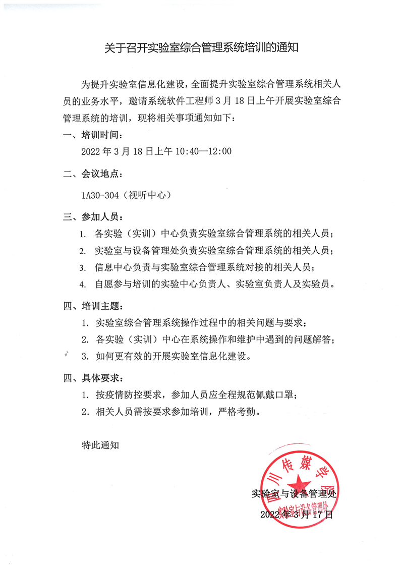 关于召开实验室综合管理系统培训的通知