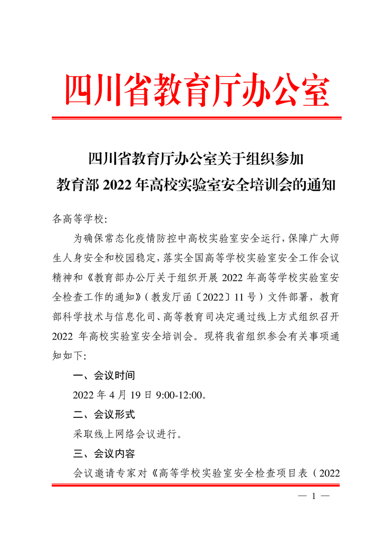四川省教育厅办公室关于组织参加教育部2022年高校实验室安全培训会的通知
