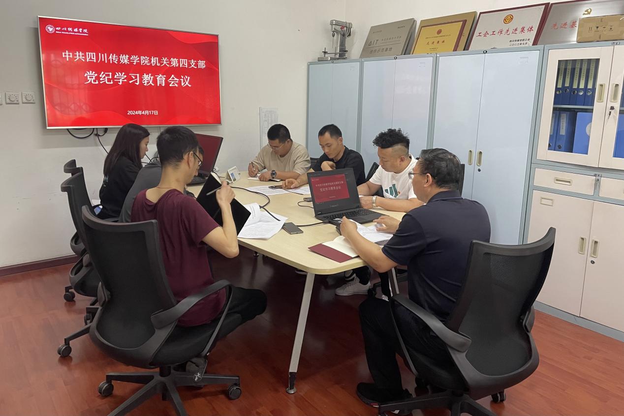 4月17日,中共四川传媒学院机关第四支部组织开展第一期党纪学习教育会议,深入学习贯彻习近平总书记关于加强党的纪律建设的重要论述,贯彻落实《中共中央办公厅关于在全党开展党纪学习教育的通知》精神和《全省党纪学习教育4月重点工作提示》要求,进一步部署和推进机关第四支部的党纪学习教育工作。杨高山书记主持会议并讲话,全体党员参加。